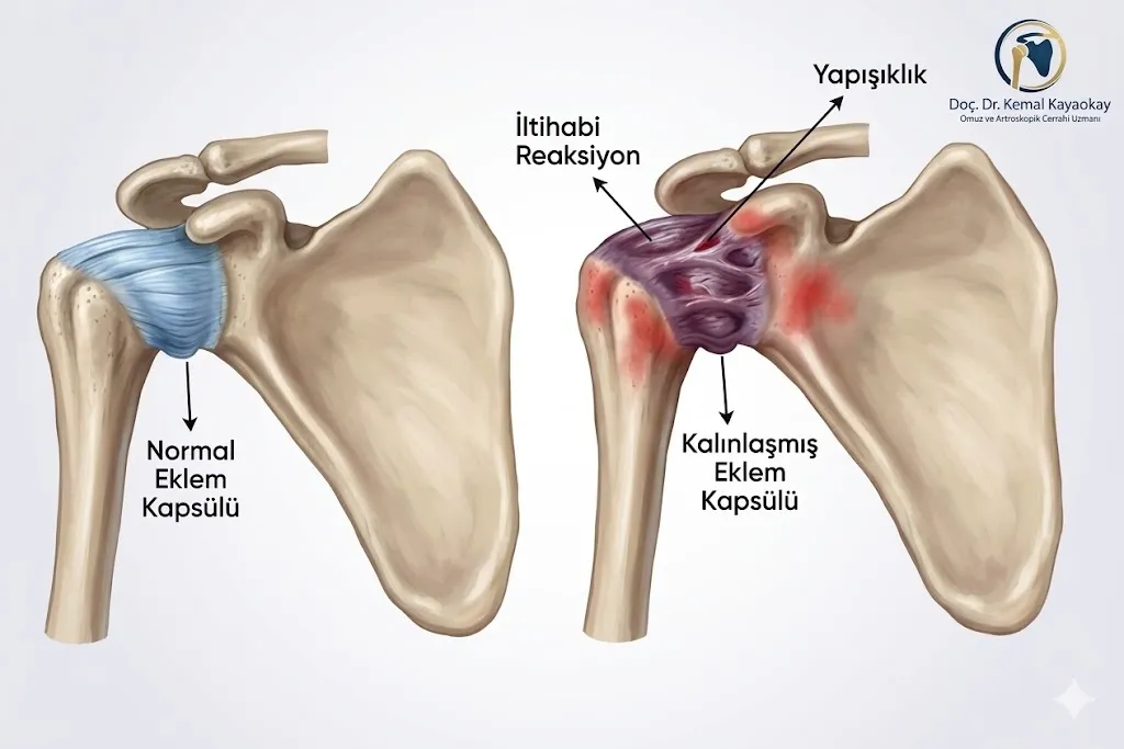 Omuz eklemimiz, kol kemiği ile kürek kemiğinin birleştiği, etrafı güçlü bir kapsülle sarılı bir yapıdır. Normalde bu kapsül esnektir ve rahat hareket imkanı sağlar. Ancak donuk omuzda bu kapsül iltihaplanır (enflamasyon), kalınlaşır ve eklem yüzeyine yapışmaya başlar. Sonuç; şiddetli ağrı ve omuz hareketlerinin her yöne kısıtlanmasıdır.